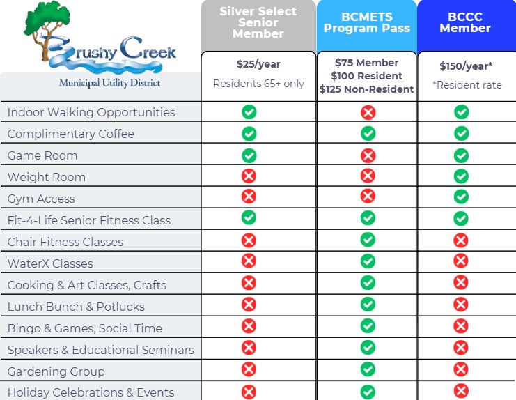 We’re excited to share that beginning Oct. 1, BCMUD will begin offering a new senior membership and an updated Senior Program Pass—the Silver Select Senior Membership and the BCMETS Program Pass. These options are designed to provide our senior residents with more choices, expanded amenities, and high-quality programming, all while keeping fees as low as possible.