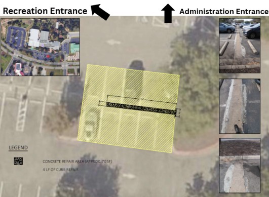 Work to repair a concrete area of the Community Center parking lot will begin Wednesday, April 22, weather permitting. Ten (10) parking spaces will be blocked off after-hours on Tuesday, April 21. These parking spaces are adjacent to the Administration entrance of the Community Center and highlighted in yellow in the image below.